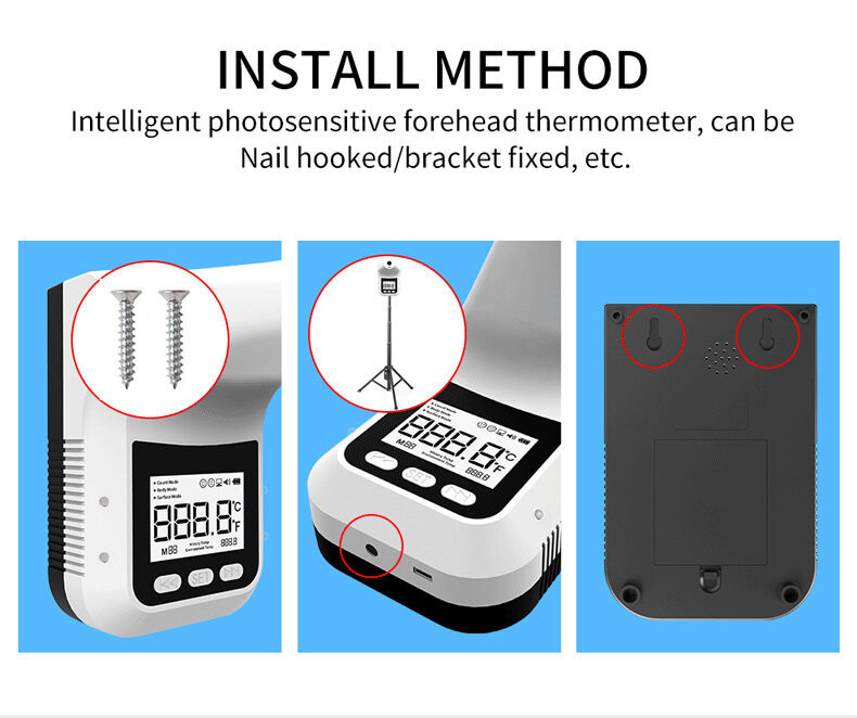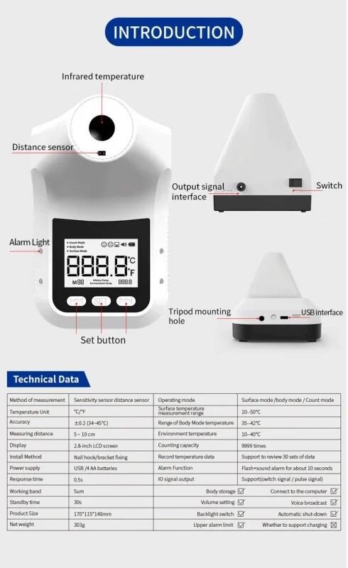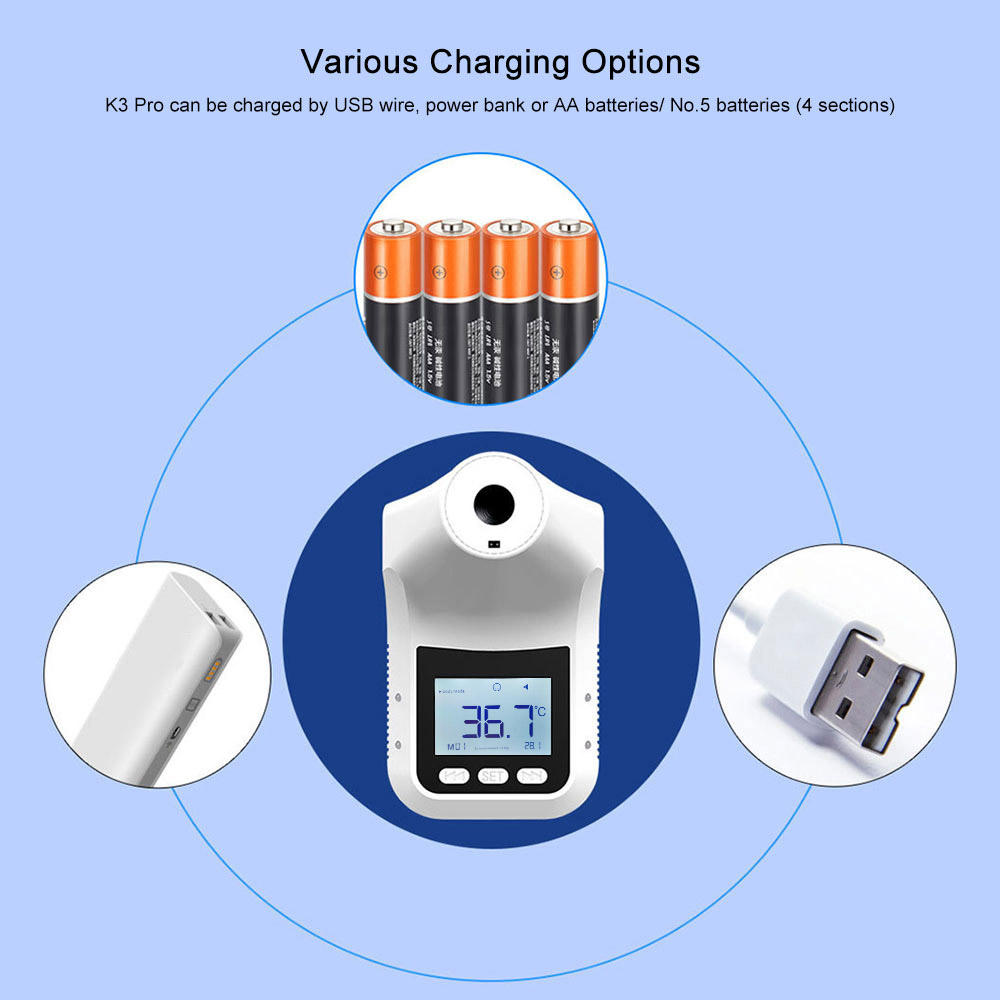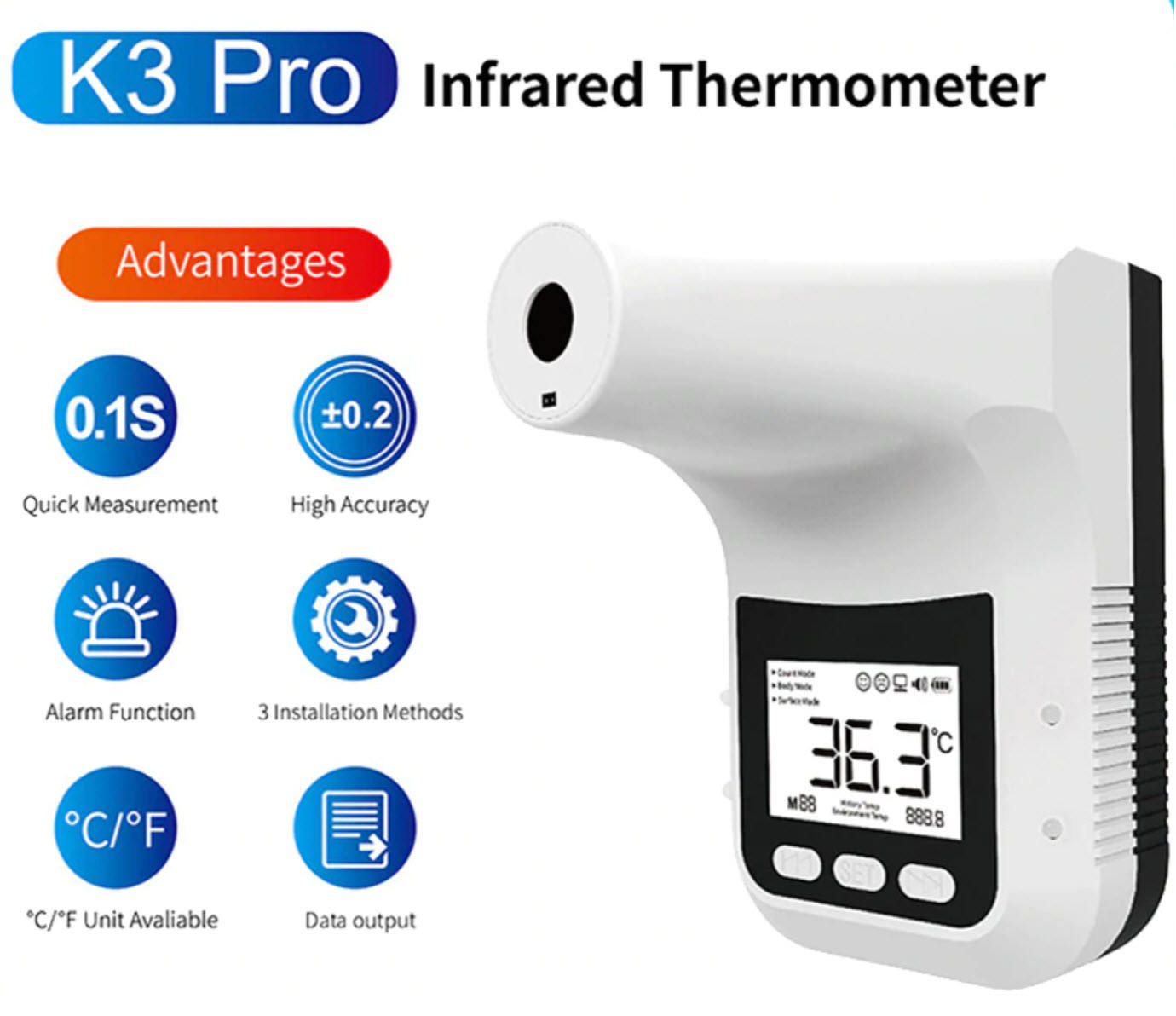 เครื่องวัดอุณหภูมิอินฟราเรด อัตโนมัติ แบบไร้การสัมผัส รุ่น K3 PRO ตรวจวัดอุณภูมิความร้อนบนร่างกาย โดยวัดอุณหภูมิผ่านทางหน้าผาก หรือ ฝ่ามือ โดยไม่ต้องสัมผัส ใช้งานง่าย รวดเร็ว และมีความแม่นยำสูง พร้อมฟังก์ชั่นหน่วยความจำจอแสดงผล LCD
